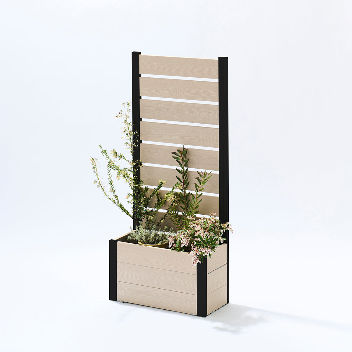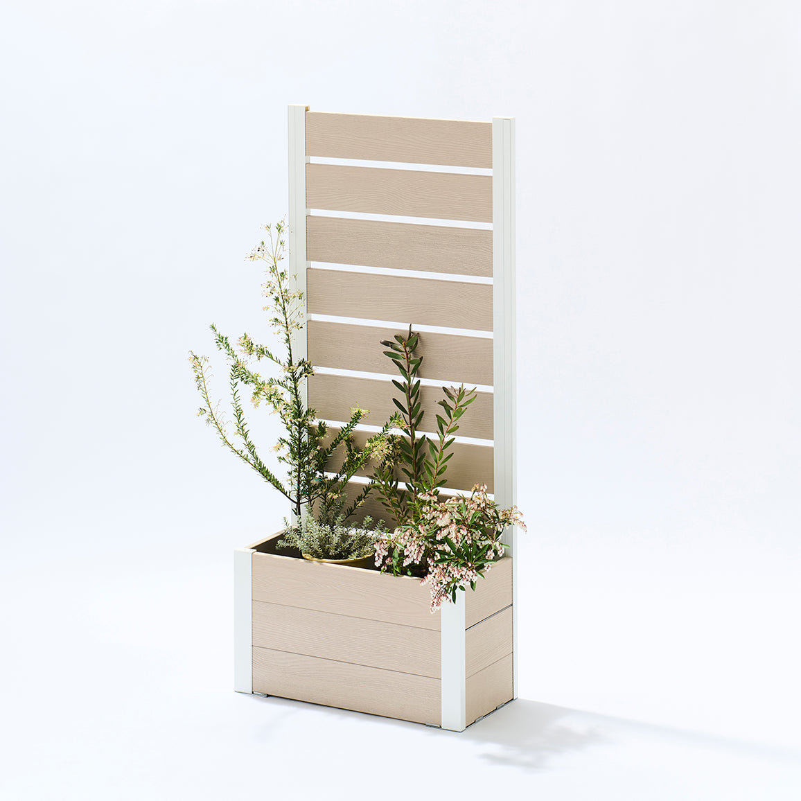 外からの気になる視線を遮りながら、プランター部分に草花やグリーンを添えることで、空間にやさしい彩りと奥行きをプラス。「隠す」だけでなく、「魅せる」楽しさも両立できるフェンスです。