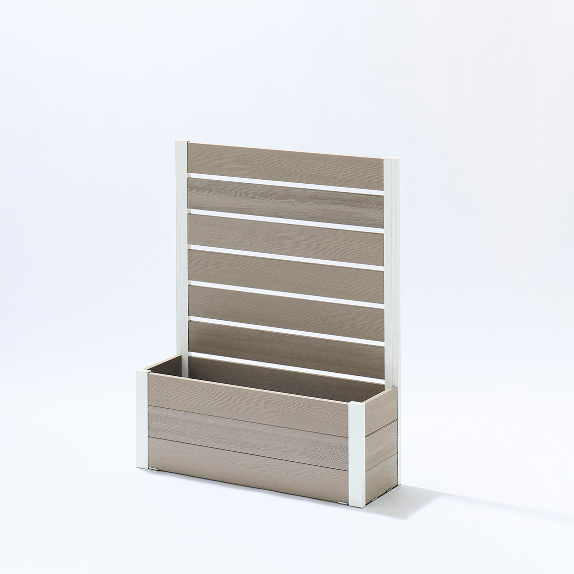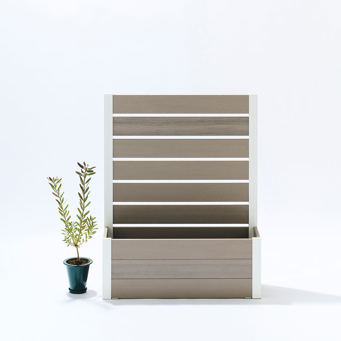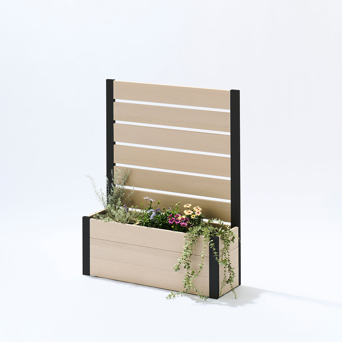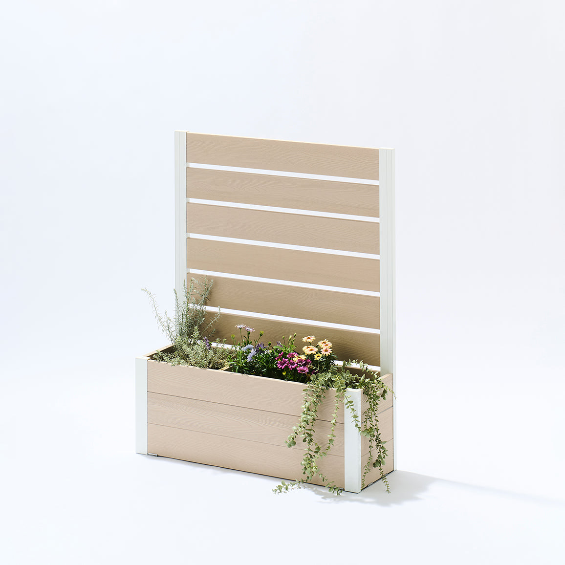 外からの気になる視線を遮りながら、プランター部分に草花やグリーンを添えることで、空間にやさしい彩りと奥行きをプラス。「隠す」だけでなく、「魅せる」楽しさも両立できるフェンスです。