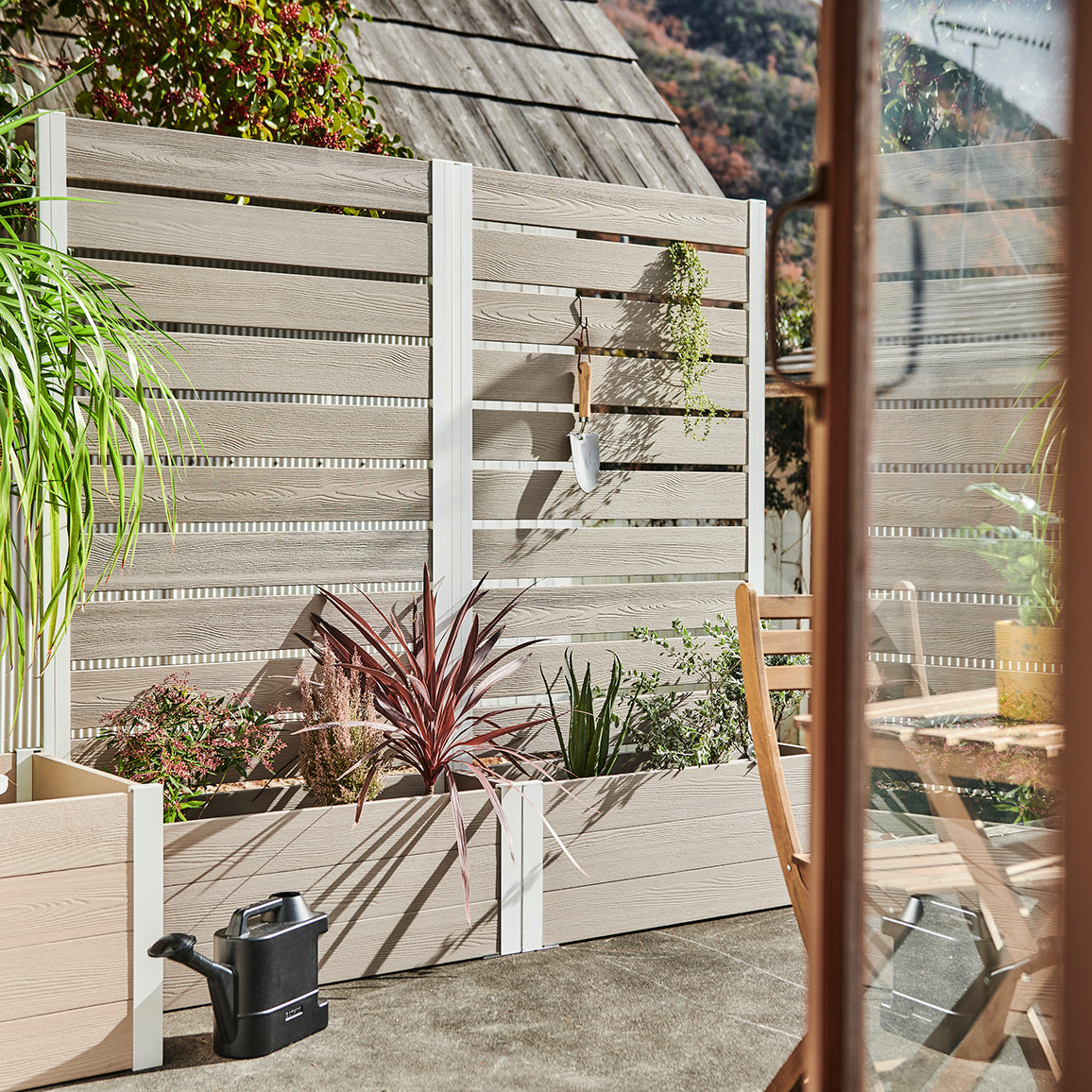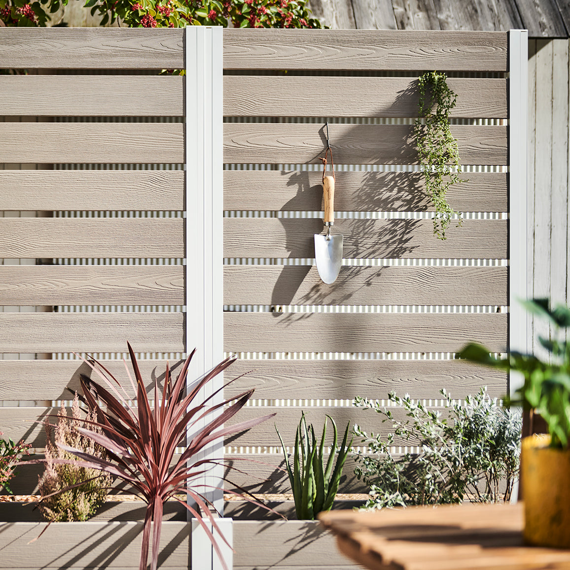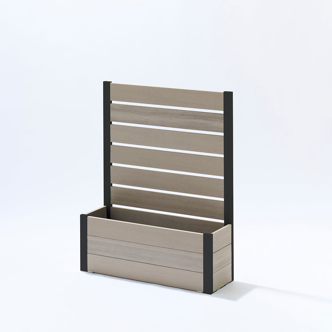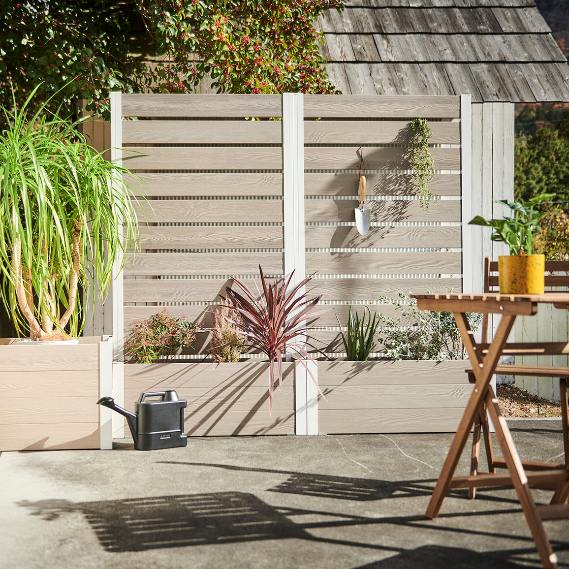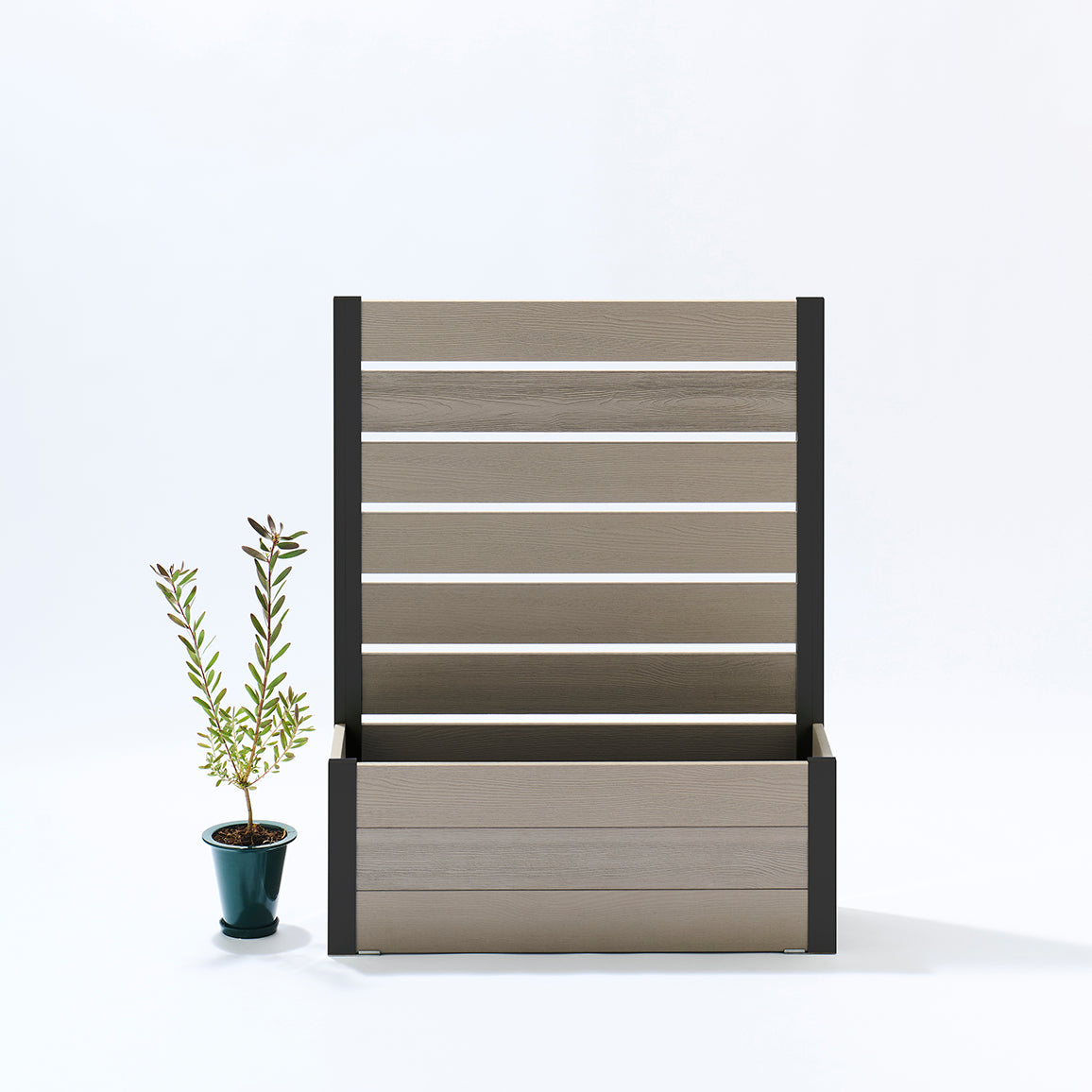 外からの気になる視線を遮りながら、プランター部分に草花やグリーンを添えることで、空間にやさしい彩りと奥行きをプラス。「隠す」だけでなく、「魅せる」楽しさも両立できるフェンスです。