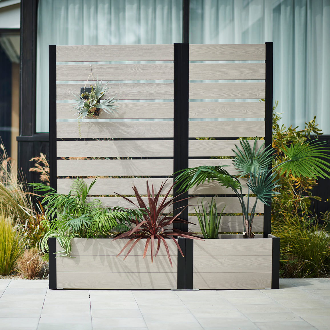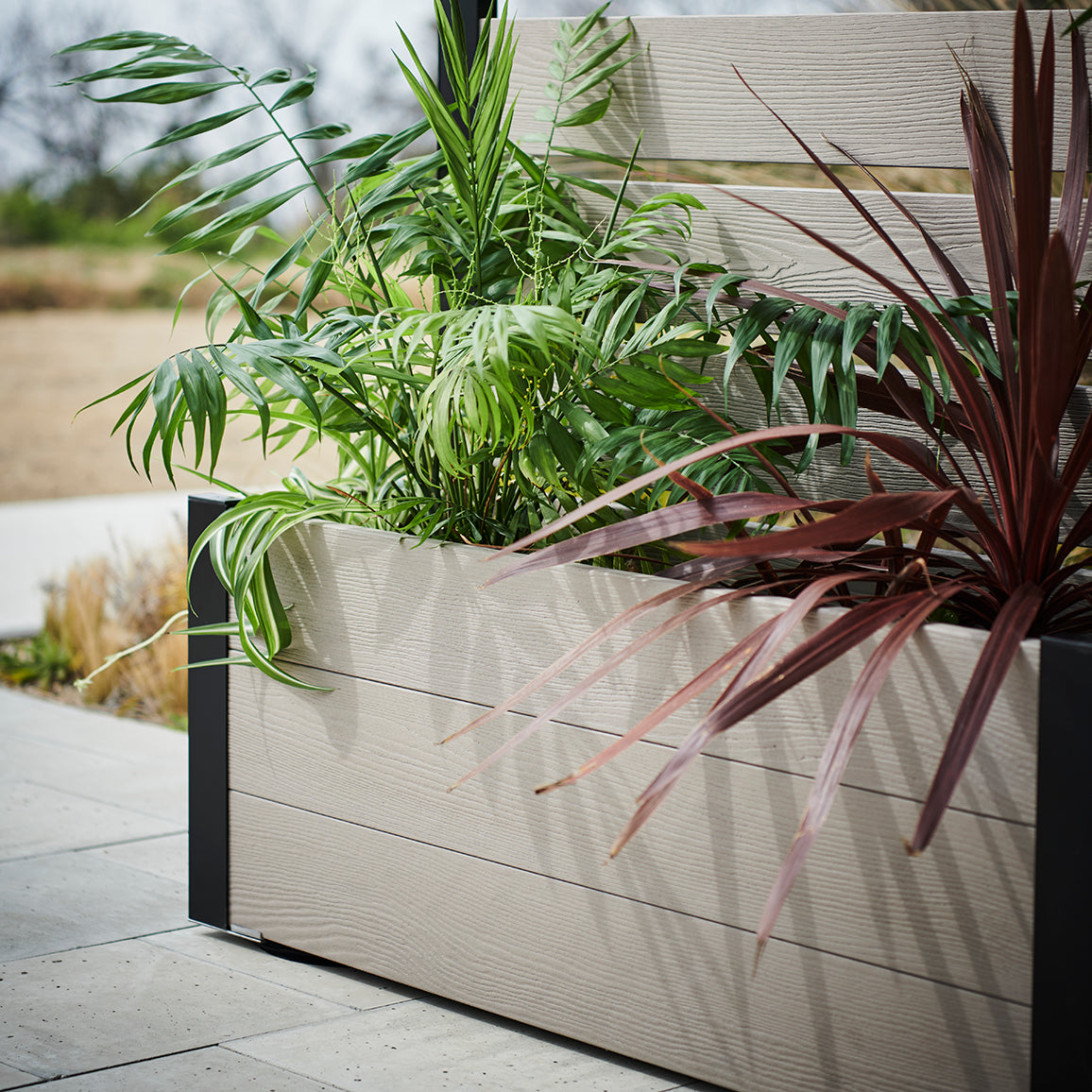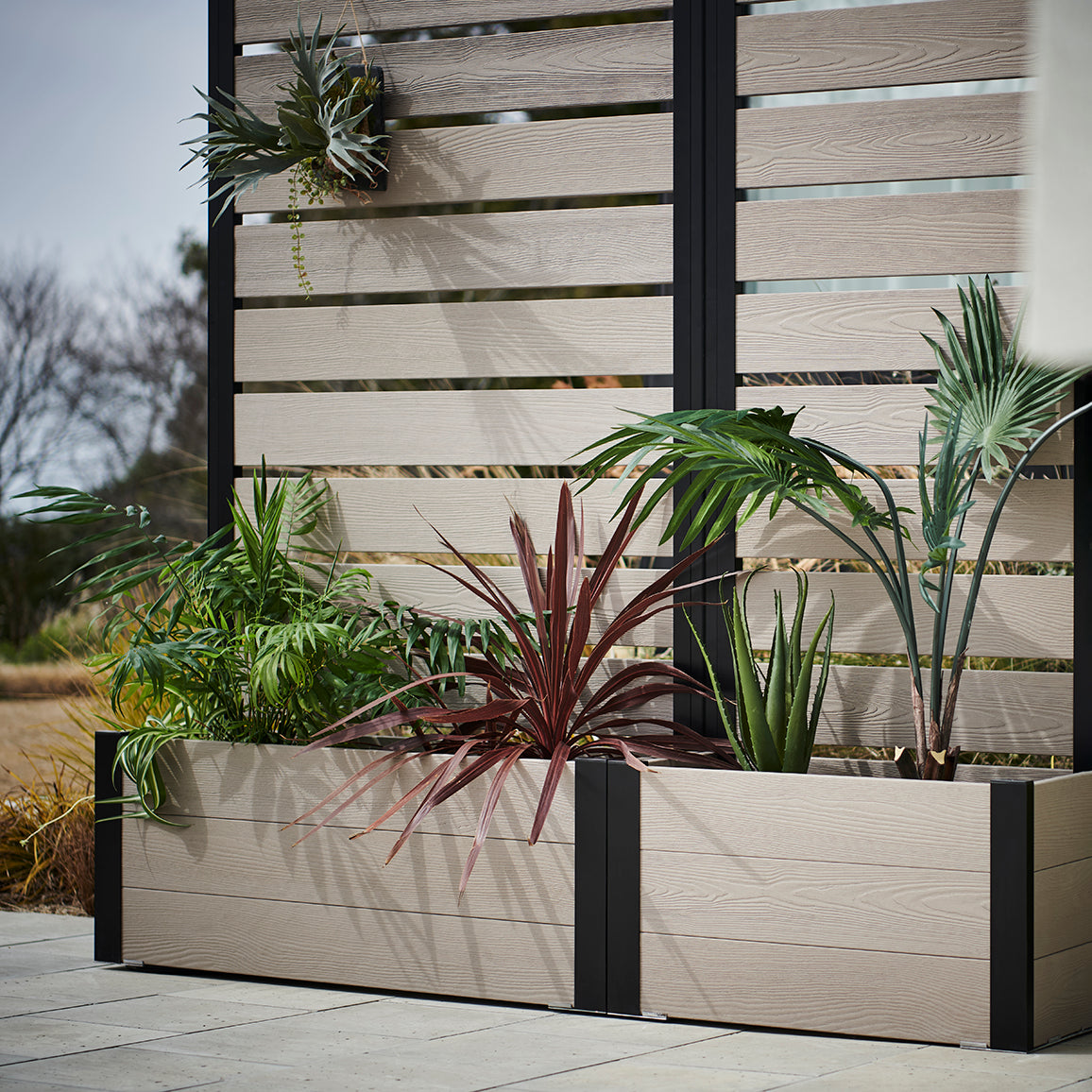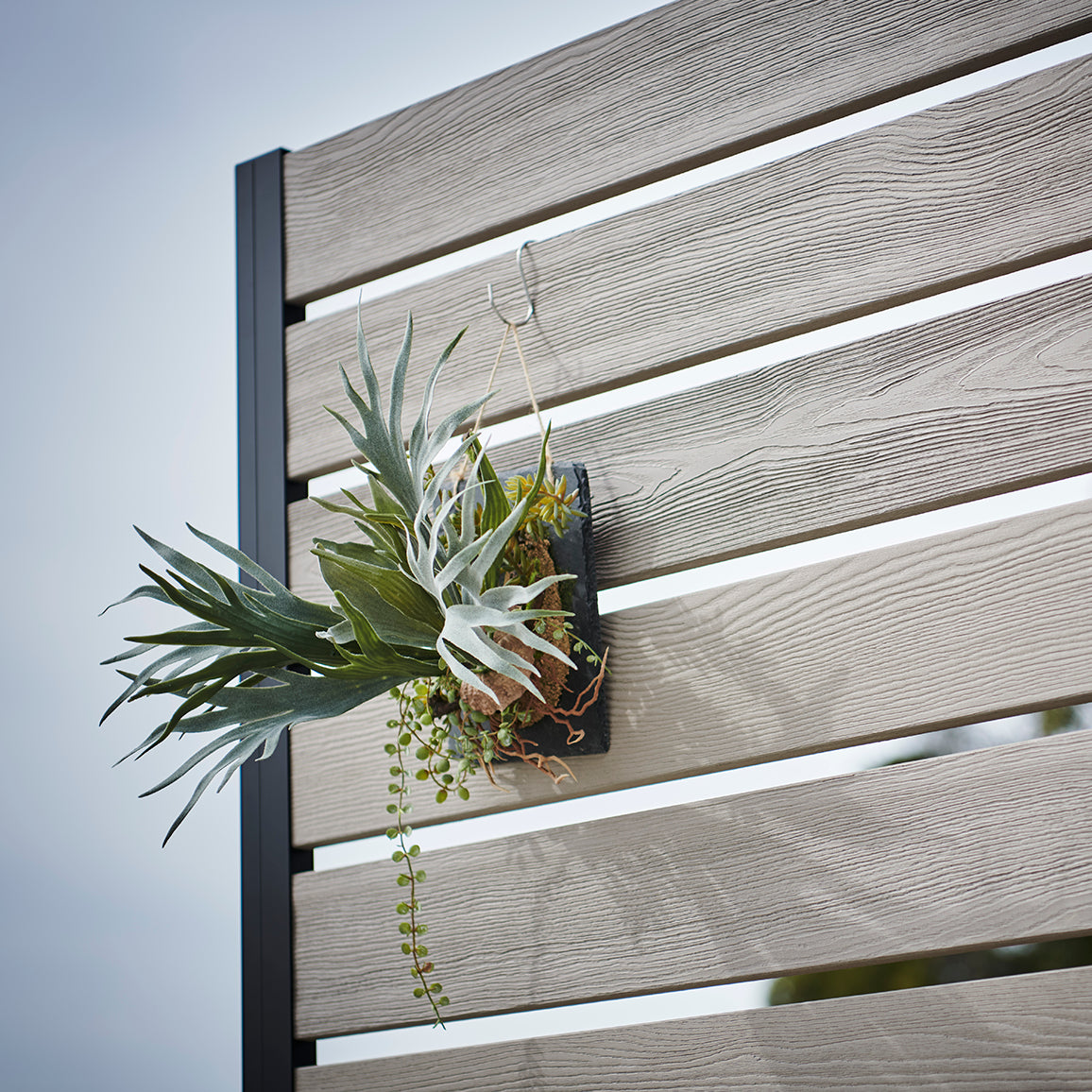 外からの気になる視線を遮りながら、プランター部分に草花やグリーンを添えることで、空間にやさしい彩りと奥行きをプラス。「隠す」だけでなく、「魅せる」楽しさも両立できるフェンスです。