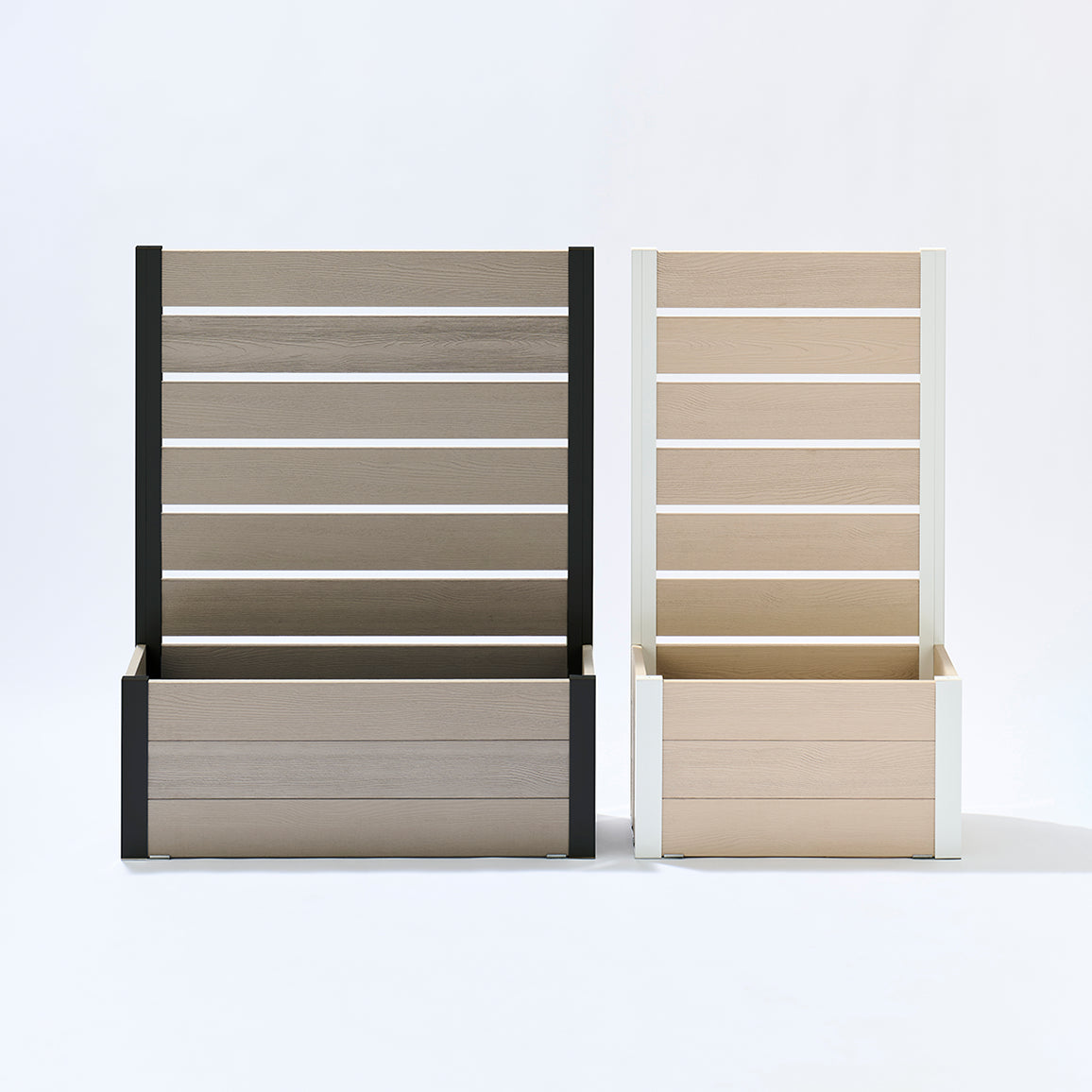 “隠すと魅せる"を両立させたniwacanのプランターフェンス。ベースサイズは900×300/600×300 の2タイプ。高さはH1200・H1500・H1800、カラーは板2色×支柱2色から組み合わせ可能。用途や設置場所に合わせて、全24パターンから最適な一台をお選びいただけます。板の隙間は、プライバシー確保と通風・採光性をバランスよく両立する20mmに設定。並べて設置することで、視線をやわらかく遮りながら、風と光を取り込む心地よい空間をつくり出します。