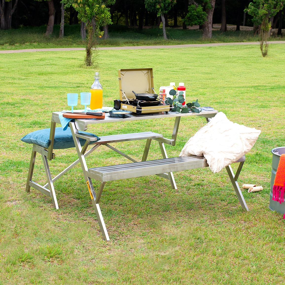 テーブル&ベンチの一体型セットと、背もたれ付きのゆったりベンチ。簡単操作で、2つのカタチに変化させられます。